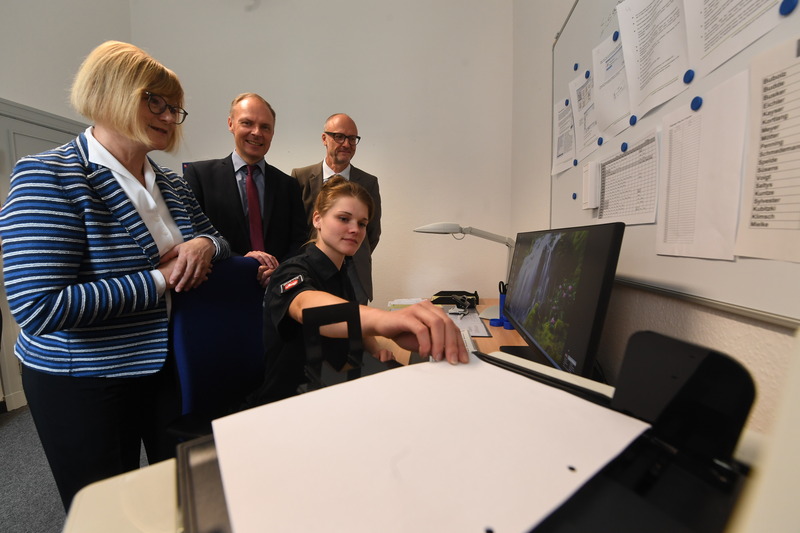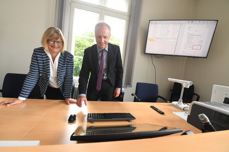 Landgerichtspräsident Dr. Rieckhoff demonstriert Justizministerin Niewisch-Lennartz die technische Ausstattung des Sitzungssaals der eKammer.